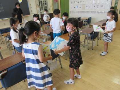 1年5組の子供たちは、図工で自分の好きなものの絵をかきました。授業の途中で「○○くん、その絵は何をかいたの?」と先生が聞いても「ないしょ!」と教えてくれません。そこで先生は次なる一手を。「では、こんどは自分がかいた絵をもって教室のお友達に自分の名前とすきなものをしょうかいしましょう。」と言って自己紹介タイムです。5組のみんなはにこにこ、うれしそうに会話を楽しみました。先ほどの話題に出てきた男の子は、自己紹介の活動中にちがう子にそっと耳うちしていたので、その絵はドラゴンをえがいていたことが分かりました。写真を撮っていた私も、飛び入り参加させてもらいました。絵はかいていませんでしたが、顔写真のついた名札(職員証)を使って自己紹介です。5組のみんな名前を覚えてくれたかなぁ…。みんなと心の距離は少し近くなってきました。どうぞよろしくお願いします!!