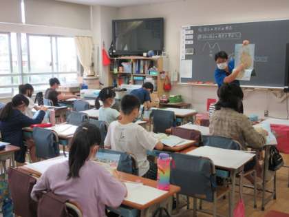 5年生の今日の授業の様子です。1組の社会では、「国土の地形と土地の特色」について学習しました。土地の高さの違いによって、名称も変わります。秋田県の盆地の話を担任の先生がすると、うれしそうに聞いていました。地図帳で場所を確かめる活動も熱心に取り組んでいました。また、3組では、日本の国土の最南端や最北端の場所について学習をしました。