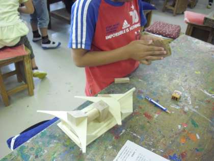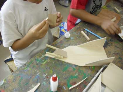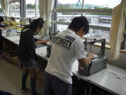 4年生の図画工作の授業の様子です。木工作「夢のオープンカー」の制作に取り組んでいるところです。板に描いた線を電動糸のこで正確に切っていきます。いろいろな木材を使って世界に一つだけの車を作ります。