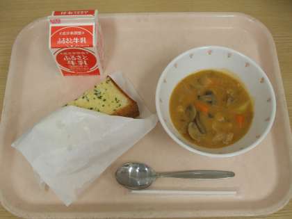 食パン(東京)、豚肉(北海道)、冷凍鶏ガラ(神奈川)、バター(北海道)、粉チーズ(オランダ・ニュージーランド)、ひよこ豆(アメリカ)、マッシュルーム水煮(山形)、冷凍グリンピース(ニュージーランド)、にんにく(青森)、パセリ(茨城)、たまねぎ(愛知)、にんじん(千葉)、じゃがいも(長崎)