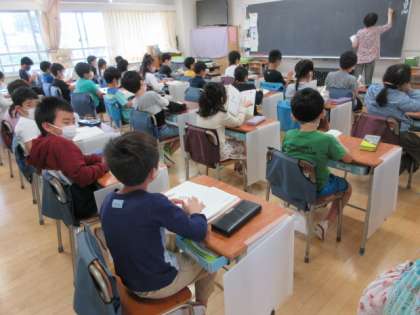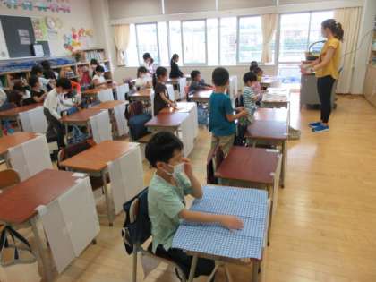 今日から設置されたのは、半透明のプラスチック段ボール。机の横、あるいは前、高学年ではロッカーの中と、いろいろなところに用意されています。必要に応じてパーテーションとして立ち上がるようになっています。メインは給食時。マスクを外して食べる際の、安全の確保です。