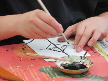 次は、墨を付けて模様を描きます。心の赴くままに、線でいろいろな形に枠取りをしていきます。なかなかおしゃれな雰囲気に仕上がります。