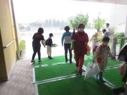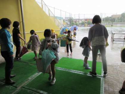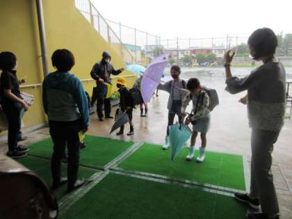 1階は、ちょうど入口の庇に入ったところで傘をたたんでもらい、カードを確認しました。見る見る子供たちが登校し、私もチェッカーを担当しました。どうやら、長靴を履いている子に限り、一時的に校庭を突っきって構わないという指示が出たようです。少しでも無駄に濡れることなく子供たちが入校できるよう、これからも工夫してまいります。