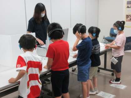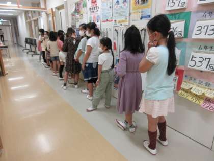 今日は、2・3・5年生の聴力検査です。保健室が扱う検査の一つで、4月当初に行う予定であった分を、順次進めているものです。場所は、1階の会議室。3年生がやってきました。先に男子が入室し、廊下の女子は、静かに様子を見守ります。「音が聞こえたら、ボタンを押すんだよ」。養護教諭の説明をしっかりと聞き、取り組んでいました。
