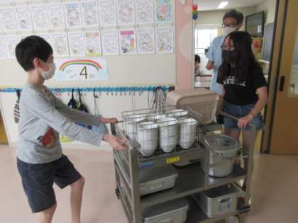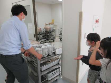どうやら、全員の片付けが終わったようです。配膳台の上を拭き、ワゴンに食缶や食器を積んで完了です。次に、各階の配膳室にワゴンを運びます。ワゴンは、配膳室に届けた順に奥から詰めて置きます。これで終わりです。