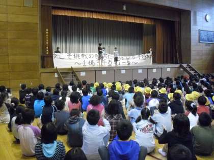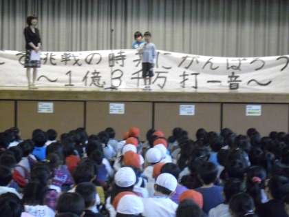 今朝の全校朝会の様子です。校長がある児童の作文「たった一人の運動会」を紹会しました。この児童は運動会には参加できませんでしたが、「今こそ挑戦のとき、共にがんばろう日本〜一億三千万打一音〜」という思いを込めた横断幕を作成しました。運動会のビデオを一人で見ながら、掲げられた横断幕にみんなと自分の存在を確認したのです。前向きな考え方に大きな拍手がわき起こりました。