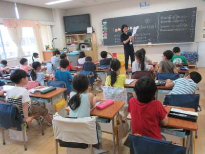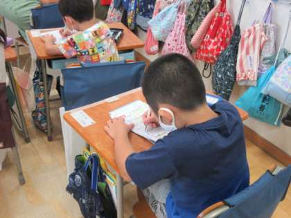1年1組の授業の様子です。通常、1年生にとって「みぎから4こ」と「みぎから4ばんめ」のちがいは苦戦する子どもたちが多い傾向にあるのですが、芦花小学校の子どもたちは、担任の先生の授業をよく聞き、しっかりと理解することができました。算数のドリルで問題を解いて、習熟もバッチリです。