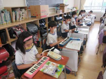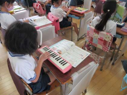 明るい歌声と鍵盤ハーモニカの奏でる音色が聞こえてきたので教室に吸い込まれるように入っていくと、そこは3年2組の音楽の授業でした。先生と一緒に鍵盤ハーモニカの学習をしています。「ドレミで歌おう」のメロディーを正しい指使いで弾くことができました。音の美しさに楽しそうに鍵盤を弾く姿は、授業を見ていた私もわくわくした気持ちになりました。