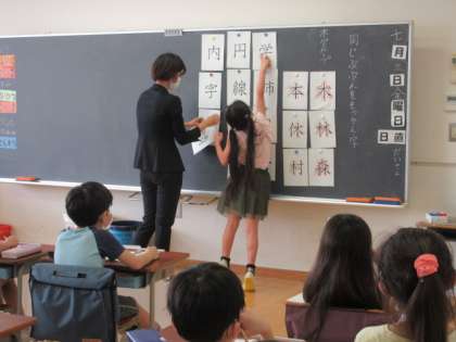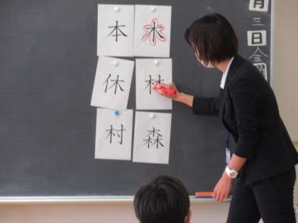 今日は本校に勤務する3人の初任の先生の授業研修を行いました。はじめは、2年1組の授業です。国語の「同じ部分をもつ漢字」では、部首が似ているところをみんなで探し当てていました。2年1組の子どもたちは、気が付いたことを先生に聞いてもらいたくてたくさん手を挙げていました。