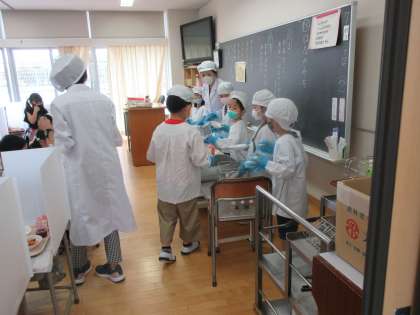 給食も3週目に入り、1年生の準備もさまになって来ました。クラスの準備のスピードは様々で、担任の関わり具合によるのだなと、つい、見比べてしまっています。(担任からすると、「いやな管理職だな」と思っているはずです。)