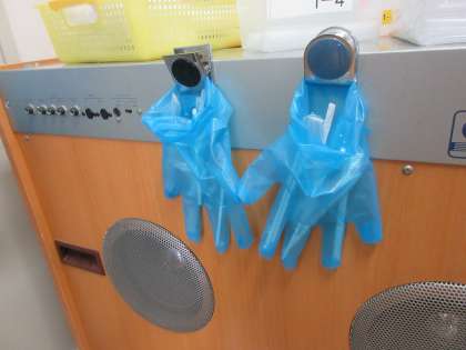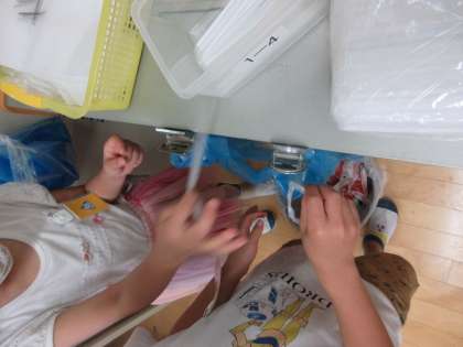 4組で、配膳、後片付けに使う手袋を、ただ捨てない取組を考えたそうです。それは、ストローとストロー袋の回収のための入れ物です。どんどんたまると、それなりに膨らんで、何とも言えない手のオブジェ。そのうち、貼り付けているオルガンを演奏するのではと思ってしまいました。