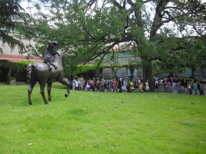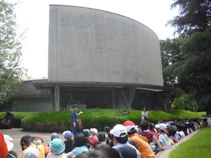 4年生の美術鑑賞教室の様子です。バスに乗って世田谷美術館にやってきました。雲の間から日差しが降り注ぎ、新緑が映えています。子どもたちをオブジェが出むかえてくれました。