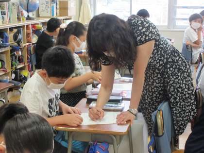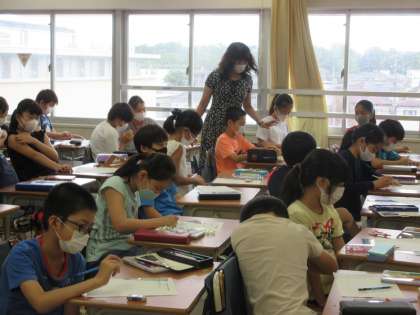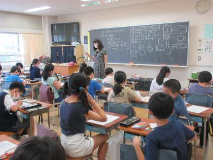 4組の家庭科です。単元名は「ネームタグのデザインを考えよう」。例年ならば、川場移動教室があり、その際の荷物に付ける名札を作成するのですが、今年は、いずれ訪れる宿泊行事を夢見ての活動ということになるのでしょうか。板書の「ひと針に心をこめて」のメッセージが、集中力を高める意味での良い緊張感を醸し出しています。基本の「並ぬい」を生かしてどんな作品が仕上がるか、とても楽しみです。