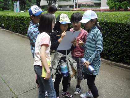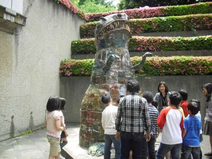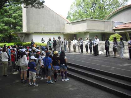 昭和60年に区内の小学校2・3年生で制作した「恐竜」のオブジェが庭に展示してありました。今日一日お世話になった鑑賞リーダーの方々にお礼のあいさつをしてお別れしました。最後は、外の彫刻を題材にしたオリエンテーリングを行いました。