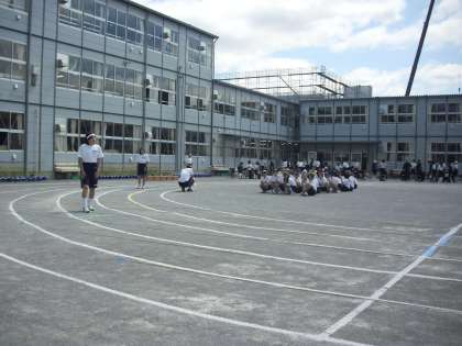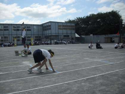 短距離走の様子です。中学生の迫力ある走りは小学生にとってはあこがれです。授業の合間に各学年が窓から校庭から中学生を応援しました。