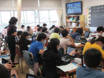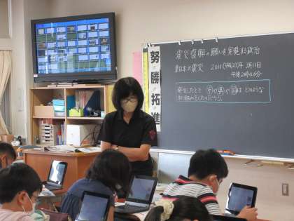 1組で、タブレットを活用した授業がありました。単元名は「震災復興の願いを実現する政治」です。東日本大震災の際の映像が複数用意され、各自の興味・関心に応じて自由視聴をしているようです。「うわー」「ひでぇー」「やばいんじゃない、これー」と、男子を中心につぶやく声が聞こえてきます。当時をほとんど覚えていない年齢の子供たち。自分事のように受け止められるでしょうか・・・