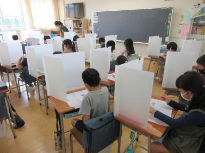 5組で、午前の授業中にパーテーションが立っています。覗いてみると、しーんとしています。子供たちの机の上を見ると、国語のワークテストが見えました。なるほど衝立の活用としてはありですね。とても静かに、落ち着いて取り組んでいました。