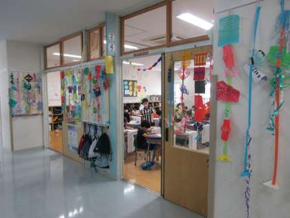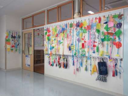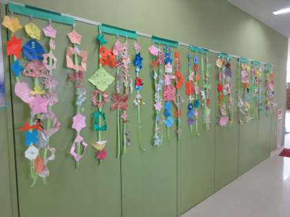 こちらは、3・4・5組の作品です。このところ、風の強い日が続いているので、廊下側ですが、わずかになびいています。
