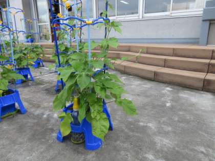 私が朝の南門でのあいさつを終えて犬走りを校舎に向かって戻ってくる途中、ふと空を見上げると2階のテラスに子どもたちの姿を発見!何をしているのかなと教室に行ってみると、1年5組の子どもたちがアサガオの鉢にお水をあげているところでした!どのくらい大きくなったかなと覗く子。つるが伸び始めているので絡まないよう鉢を一生懸命移動させている子。水をたくさんかけて満面の笑みで先生のところにかけていく子。などなど、植物の生長を楽しみながらお世話する姿がほほえましいです。