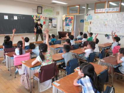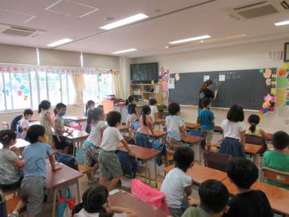 さて次は1年3組の1時間目の様子です。国語のひらがな「な」の学習をしていました。担任の先生がわざと「な」を間違えてかくと・・・。3組の子どもたちはすぐにまちがっているところを見付けて、勢いよく手を挙げて答えていました。2枚目の写真は、はじめに全員が立ち、「な」のつくことばを誰かが言うと、同じ考えをもっていた子は座り、次々にことばを発言していく様子です。集中して学習することが少しずつ身に付いているようです。