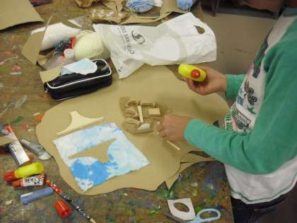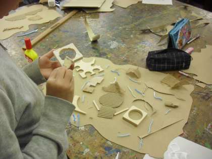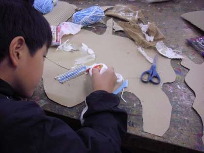 5年生の図画工作の授業の様子です。「凹凸広場に絵の具が走る」の制作に取り組んでいるところです。ダンボールを好きな形に切りとって、その上に様々な材料を工夫してのせていく、作るのが楽しい作品です。