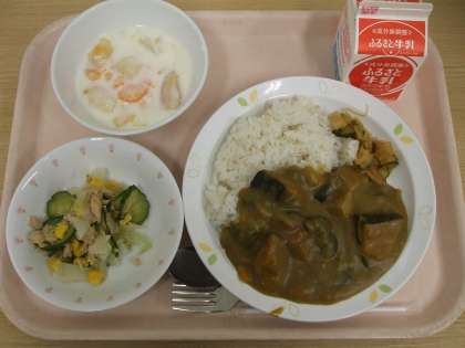 今日は、旬を迎えた“夏野菜”をふんだんに使い、「夏野菜のカレーライス」を作りました。使った夏野菜は、ピーマン、かぼちゃ、トマト、ズッキーニ、なすの5種類です。形が残るように大きく切ったり、色が悪くならないように下茹でしたり、夏を感じられるカレーになるよう工夫してみました。