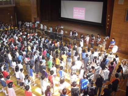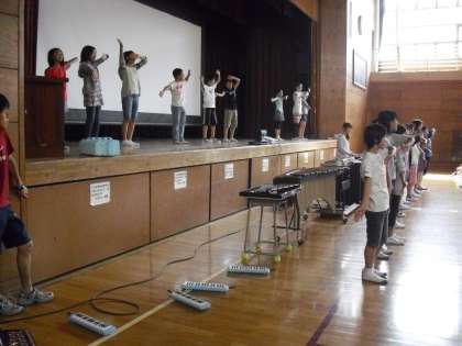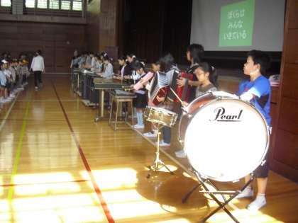 今朝の音楽朝会の様子です。今月の歌は「手のひらを太陽に」です。器楽委員会が歌に合わせた振り付けの見本を見せてくれました。みんなで歌いながら体を動かします。