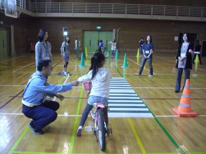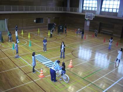 練習用の横断歩道、塀に見立てた卓球台等、いくつかの条件を付けて右左を確認してから発進することを繰り返しました。左右の安全確認を怠らないように、校外班の保護者の方にも協力していただき、自転車教室を行うことができました。