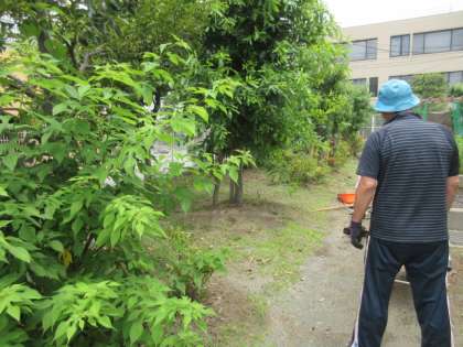 学級園に生えた雑草の草刈りをしたり、ゴミを集めて袋を取り替えたりします。