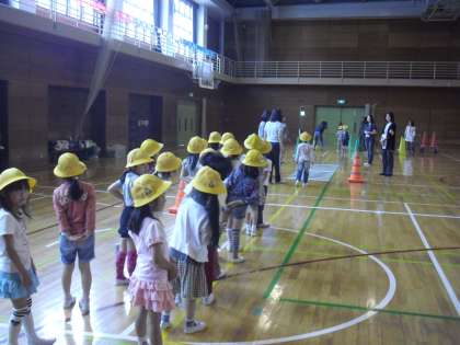 道路に飛び出さないように、「右を見て、左を見て、もう一度右を見て」安全を確認します。全員が行うことができました。普段の生活の中でしっかり守っていきましょう。