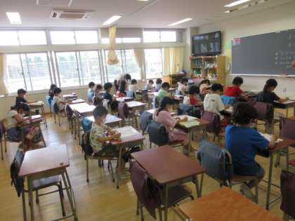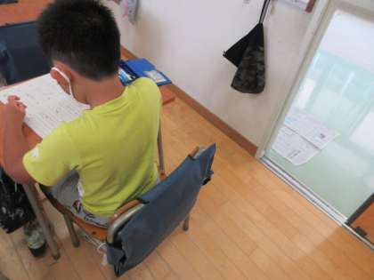 夏季補習が始まって3日目を迎えました。写真は1・2年生の教室での様子です。ソーシャルディスタンスを保つため、低学年は補習をする日を2クラスずつに分散して行っています。一生懸命に算数や国語を中心に頑張って学習しています。