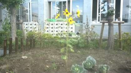 ヒマワリは職員室前の学年園、ホウセンカは1階の昇降口に入る手前にあります。
