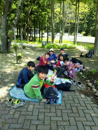 今日のお昼は、お家の方が作ってくれたお弁当です。宿舎の前の庭で食べました。早起きだったので、お腹が空いているようで、みんな美味しそうに食べていました。