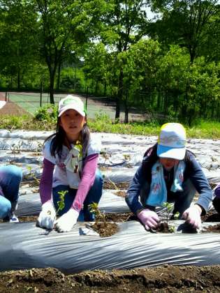 さつまいもの苗を植え付ける農業体験です。一人5本ずつ苗を植えます。まっすぐにさして、土を根本に盛り手でしっかりと押さえます。