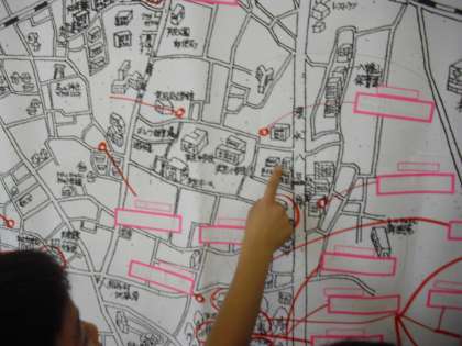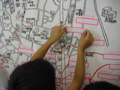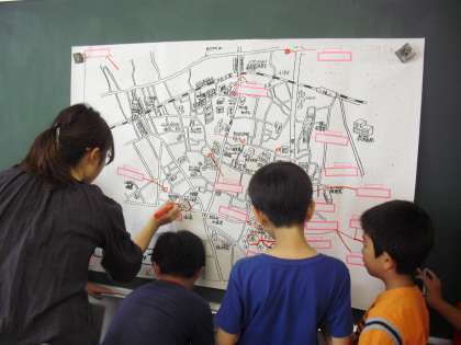 2年生の生活科の授業の様子です。「町たんけん」の計画を立てているところです。グループ毎に探検したい場所を話し合い、拡大した地図上に表していきます。2年生は今から楽しみにしているようです。