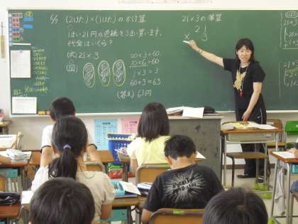 3年生の算数の授業の様子です。かけ算のひっ算の計算を学習しているところです。ただ計算の方法を習うのではなく、その仕組みをみんなで考えながら理解を深めていきます。