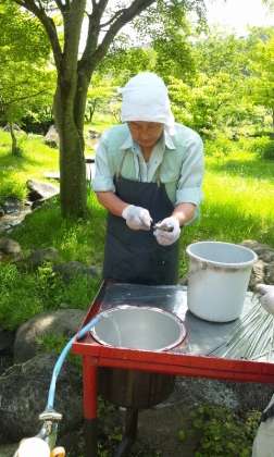 捕まえた鱒はその場でさばいてくれます。生きている魚をさばくのを近くで見るのは初めての子どもがほとんどで、近くでくいいるように見ています。