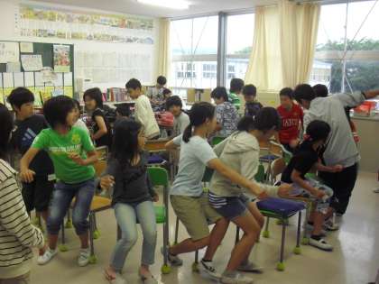 これは6年生の教室です。いす取りゲームをしたり、柔らかい素材の物をボール代わりにして遊んだり、ハンカチ落としをしたりと、クラス毎に楽しんでいました。