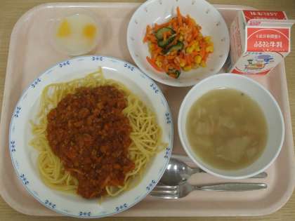 スパゲッティ(アメリカ・カナダ)、豚ひき肉(千葉)、鶏肉(青森)、冷凍鶏ガラ(神奈川)、ベーコン(日本・デンマーク)、ツナ(静岡)、レンズ豆(アメリカ)、粉寒天(南米・地中海)、ダイストマト(イタリア)、マッシュルーム水煮(岡山)、ホールコーン・たまねぎ・にんじん(北海道)、セロリー・パセリ・キャベツ(長野)、ピーマン(茨城)、きゅうり(秋田)、レモン(愛媛)、黄桃缶(国産)