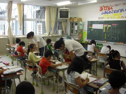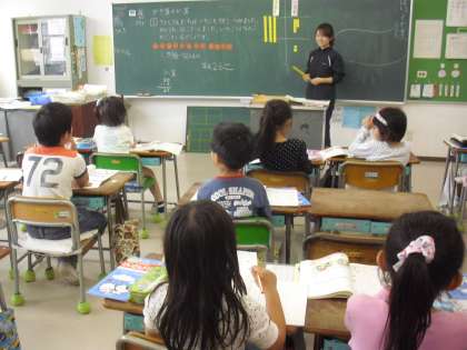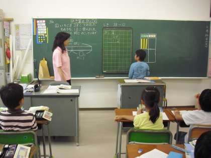 2年生の算数少人数指導の授業の様子です。引き算の筆算を学習しているところです。10のかたまりのブロック、1のブロックを使いながら、計算の仕方についてみんなで考えます。