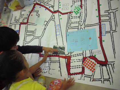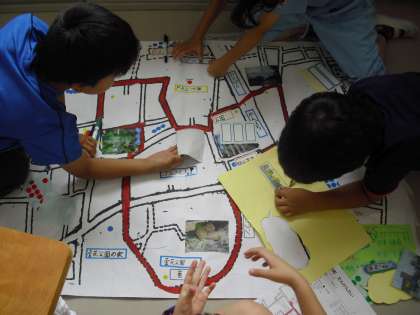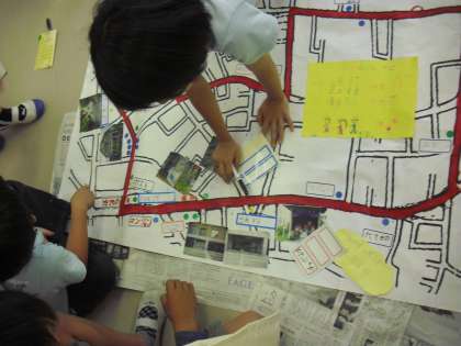 3年生の社会の授業の様子です。取材に行った地域で撮った写真を、グループ毎に地図にはっているところです。自分たちが調べた地域の様子がだんだんと具体的になってきました。