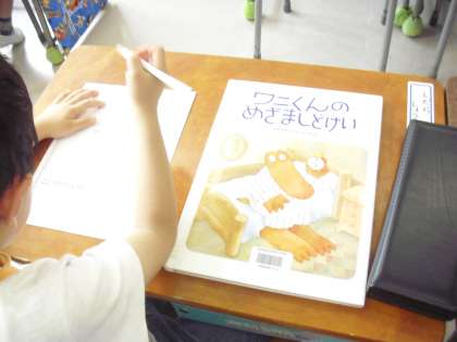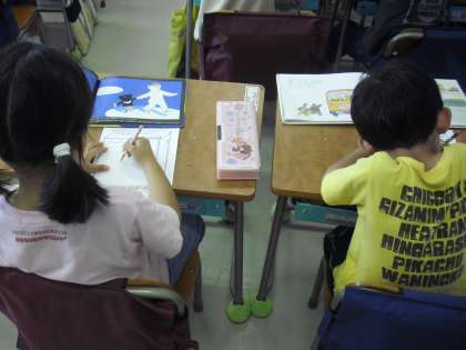 1年生の国語の授業の様子です。お友達に紹介したい本をカードに書いているところです。題名を書き、好きな場面の絵を描いて、簡単にお話を紹介します。これからどんどん紹介したい本を増やしていきたいです。