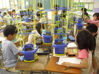 2年生の生活科の授業の様子です。教室に鉢を運び、ミニトマトの観察をしているところです。実がまた少し大きくなっていました。実・葉・茎の長さや大きさを定規を使って確かめている人もいました。