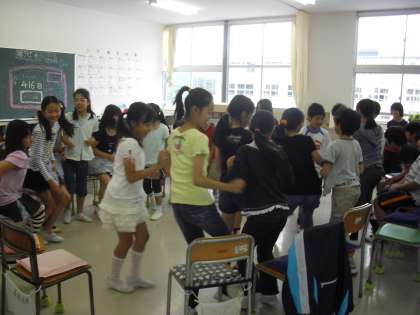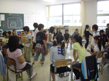 1・3・5年生は室内遊びです。室内でも工夫して遊んでいます。ボールの代わりにタオルを丸めて使ったり、いす取りゲームをしたりしています。