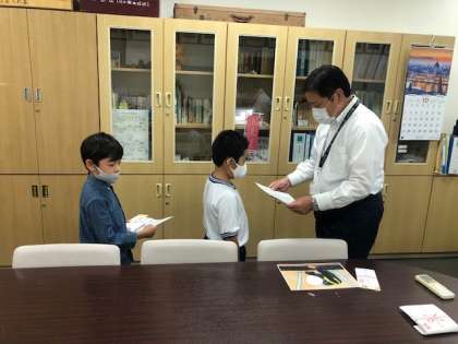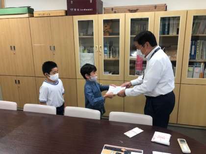 休み時間に校長先生の部屋で表彰を行い、表彰状と賞品を受け取りました。