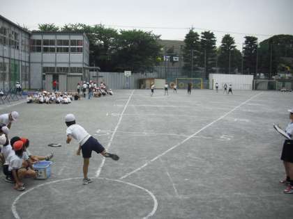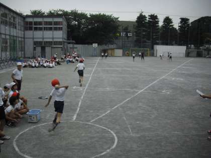 体力テストの様子です。1・2時間目は2年生と5年生、3・4時間目は1年生と6年生、5・6時間目は3年生と4年生が行いました。校庭ではソフトボール投げを行いました。