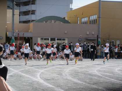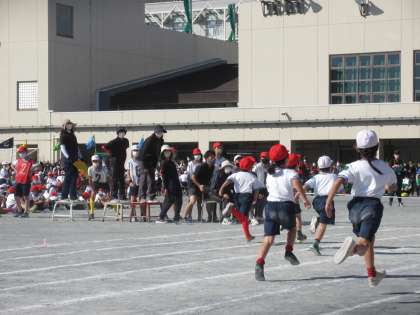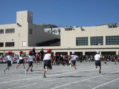 2年生の50m走です。直線のコースを真っ直ぐに走り抜けていきます。一生懸命ですね!