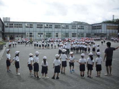今朝の体育朝会の様子です。雨で延期になっていた長縄大会です。各クラスで5分間に何回跳べるか記録に挑戦します。体育の授業や休み時間、学年によっては朝練等を行ってきました。