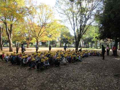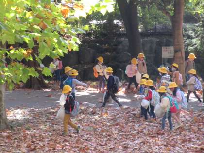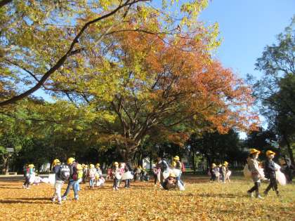 絶好の秋晴れのもと、1年生は、芦花公園で「秋さがし」をしました。ドングリやマツボックリを期待していた子供たちには、ちょっと残念な機会になってしまいましたが、大小色とりどりの葉っぱたちが、「私のことをつかまえてごらんよ」と言わんばかりに迎えてくれました。なぜか木の棒ばかりを収集する子や、葉っぱの大きさを競う子など、思い思いの活動が展開されていました。帰校後の3校時目は、集めてきた素材を使って図工の時間を楽しみました。