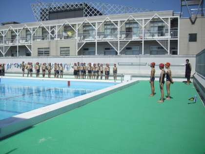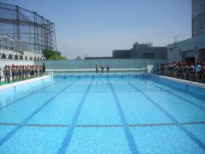 5年生のプール開きの様子です。強い日差しが降り注いでいます。各クラスの代表児童が、水泳学習でのめあてを発表しました。そして、安全に水泳の学習ができるようにプールに向かって礼をしました。
